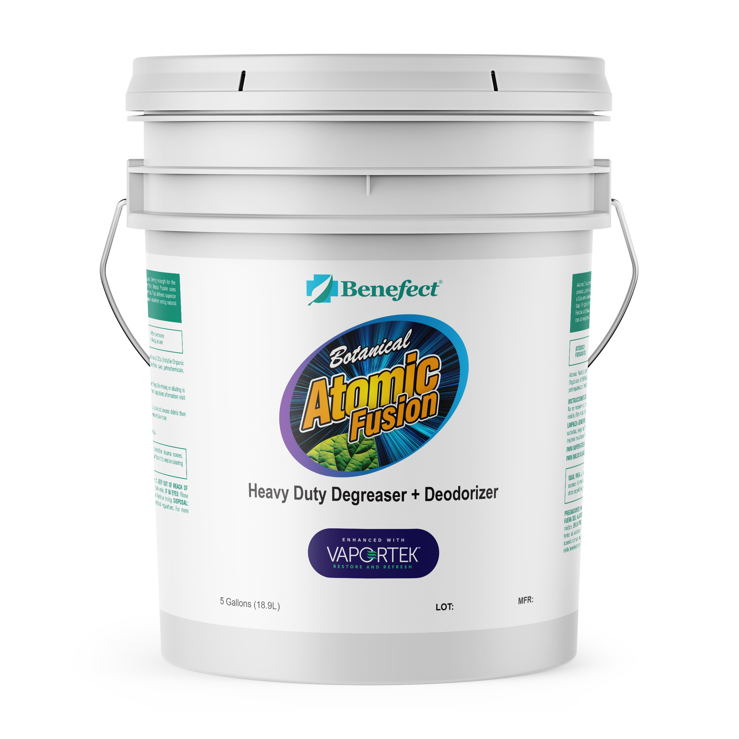 Benefect Atomic Fusion Heavy Duty Degreaser + Deodorizer is a botanical, high performance cleaner. Strong enough for the heaviest greasy soils but safe to use around children, pets, and the chemically-sensitive. Atomic Fusion delivers superior penetration of the soils for easy and effective cleaning. Atomic Fusion also neutralizes malodors using natural essential oil compounds formulated to meet commercial and industrial needs.